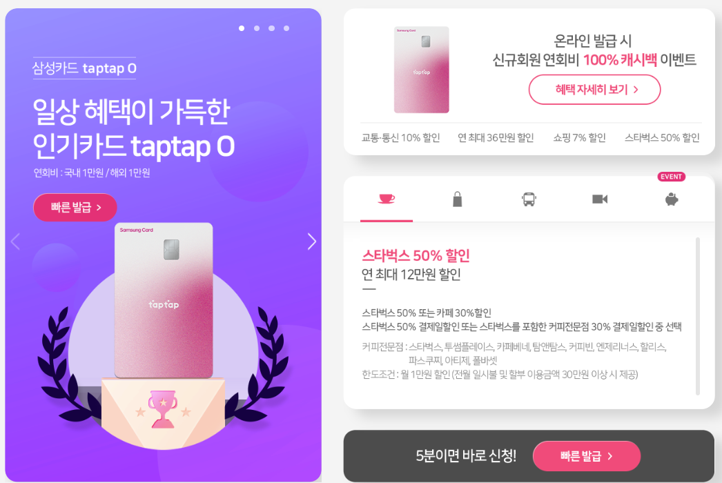 A: 삼성카드 taptap이 정기 결제에 강력합니다! 넷플릭스, 멜론은 물론 쿠팡, 배달의민족, 스타벅스, 올리브영, 대중교통까지 할인 혜택이 다양해요.
