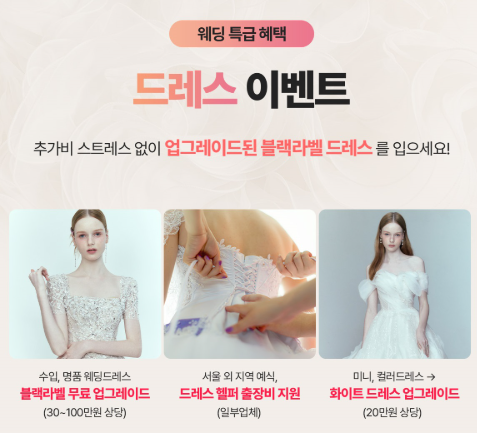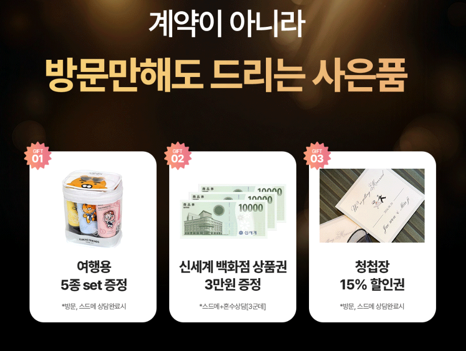 - 무료 상담 신청만 해도, 여행용 5종 set증정, 신세계 백화점 상품권 3만원 증정, 청첩장 15% 할인권